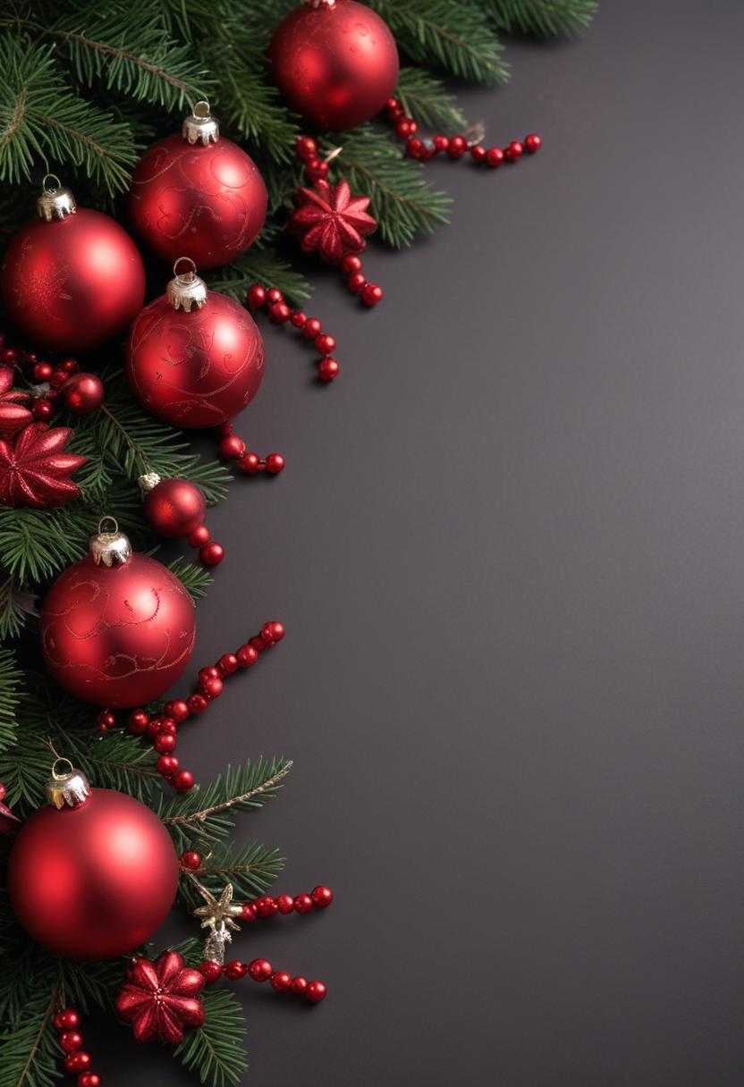 Red Christmas ornaments and pine branches with red berry garland on a gray background.