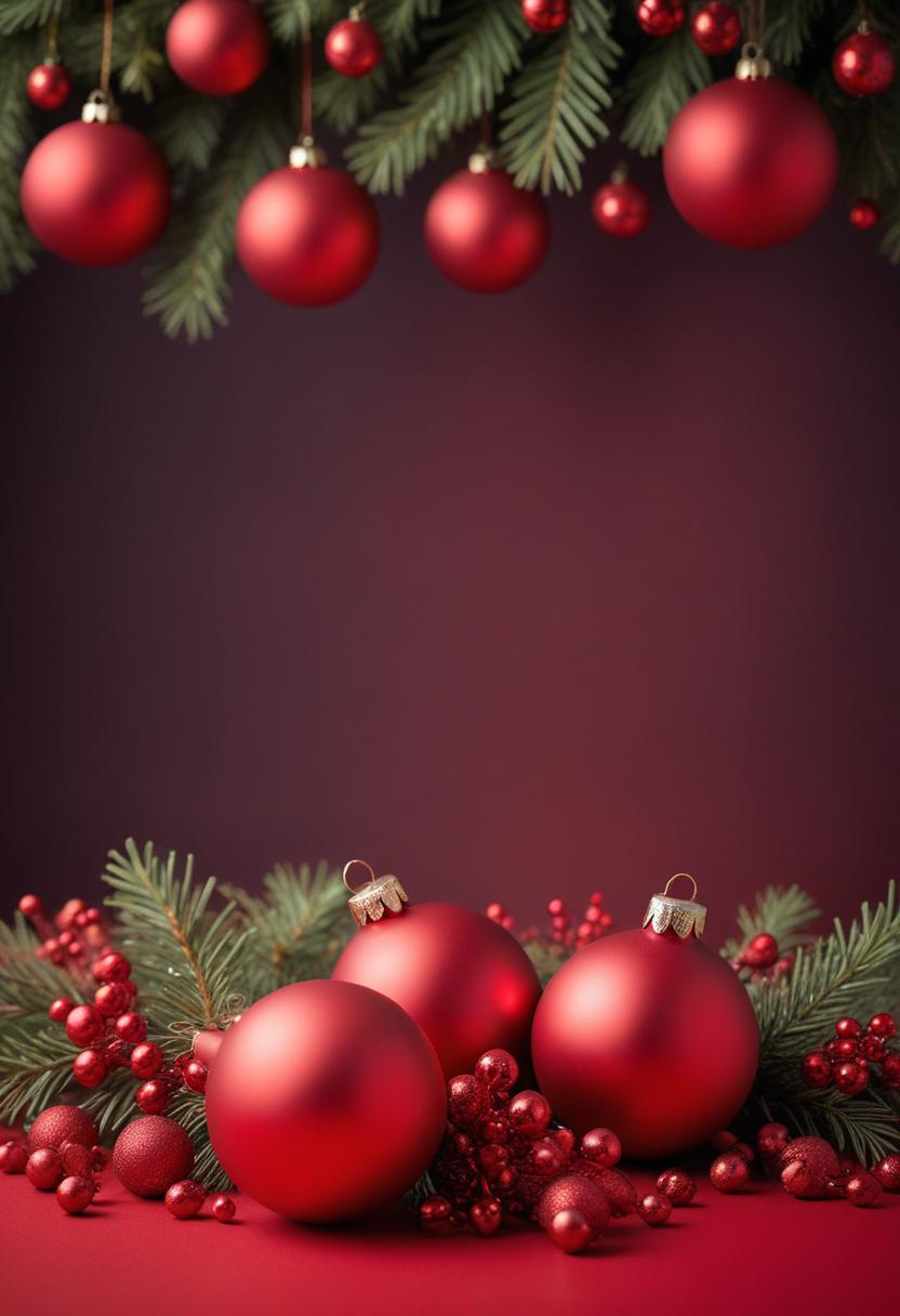 Red Christmas ornaments are hanging from a pine branch against a burgundy background. The ornaments are shiny and reflect light.