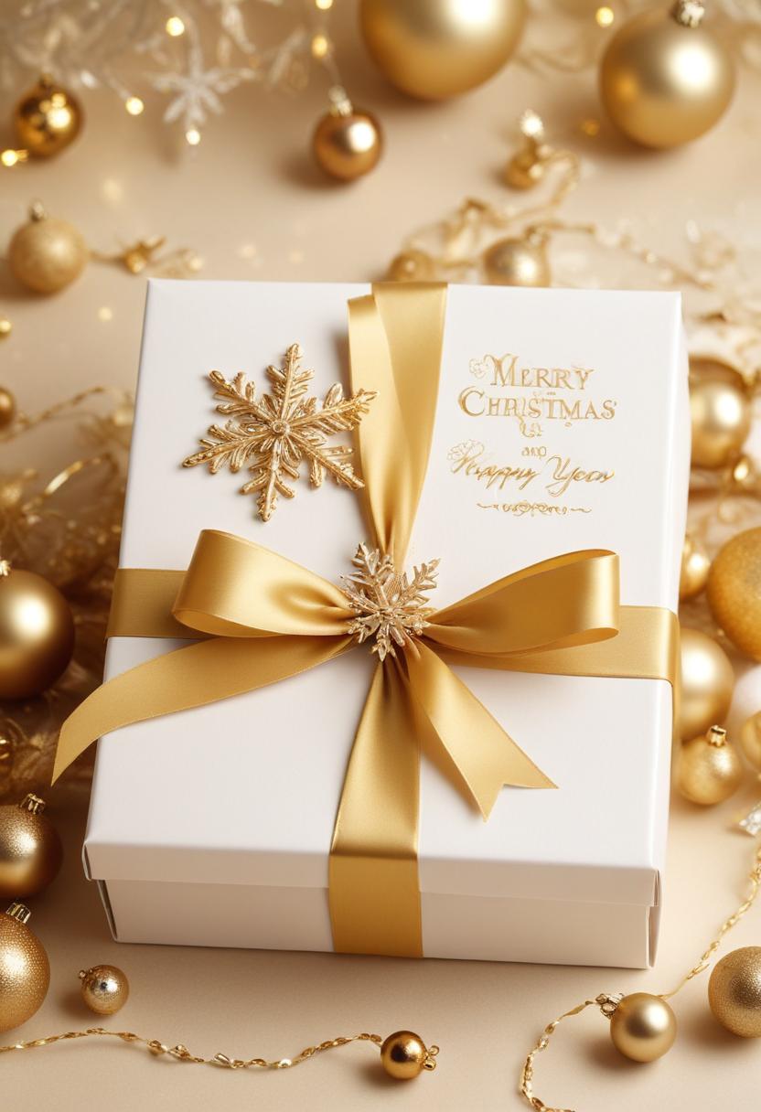 bow, box, celebration, christmas, december, decoration, festive, gift, gold, happy, holiday, ornament, present, ribbon, season, snowflake, sparkle, table, white, year