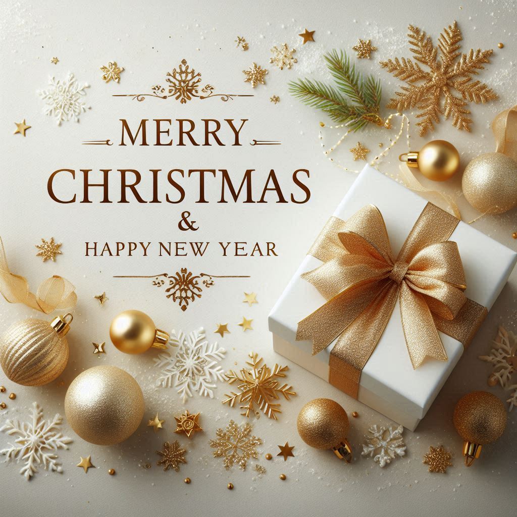 A white gift box with a gold ribbon and bow sits on a white surface surrounded by gold and white ornaments and snowflakes.