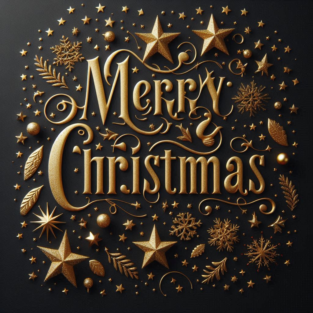 A 3D rendering of Merry Christmas in gold script. The words are surrounded by a design of gold stars, snowflakes, and leaves. The background is black.