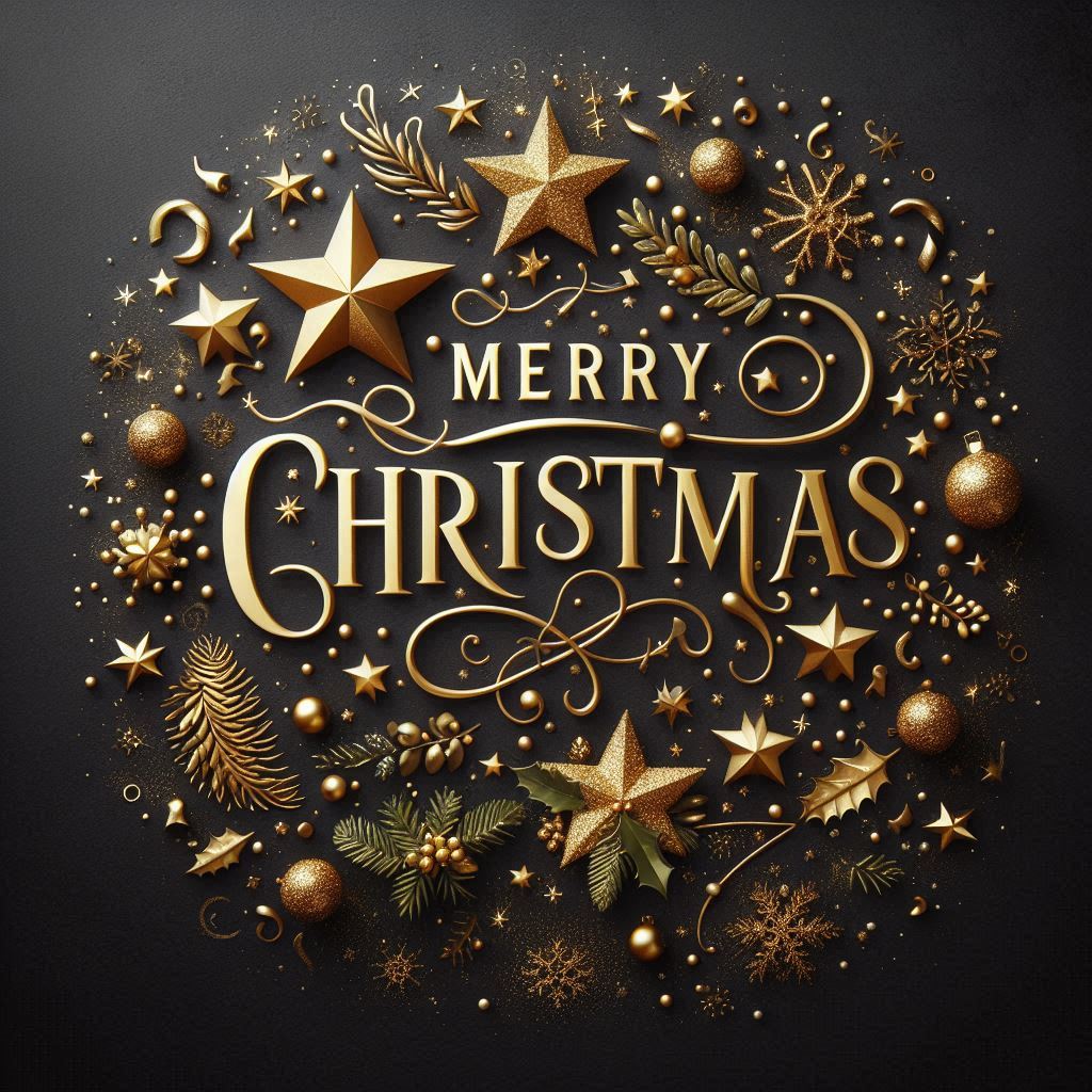A gold Merry Christmas message with a festive arrangement of stars, ornaments, and holly.