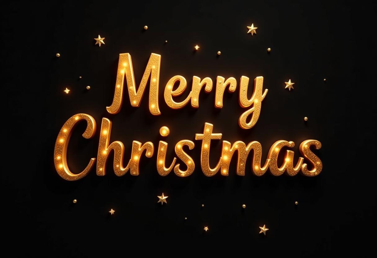 A golden Merry Christmas sign with lights shines against a dark background, with scattered stars around it.
