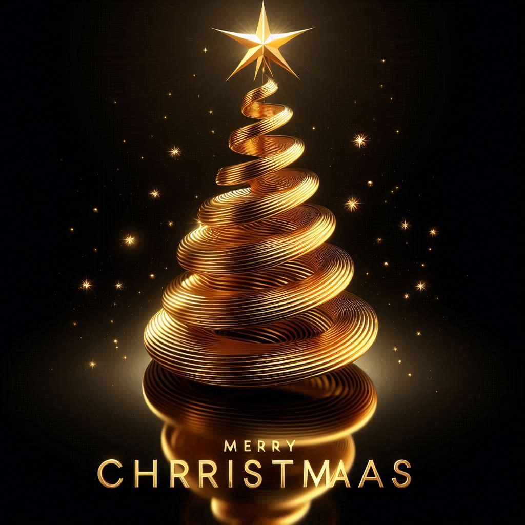 A golden spiral Christmas tree, with a single star on top, is set against a black background with white stars.