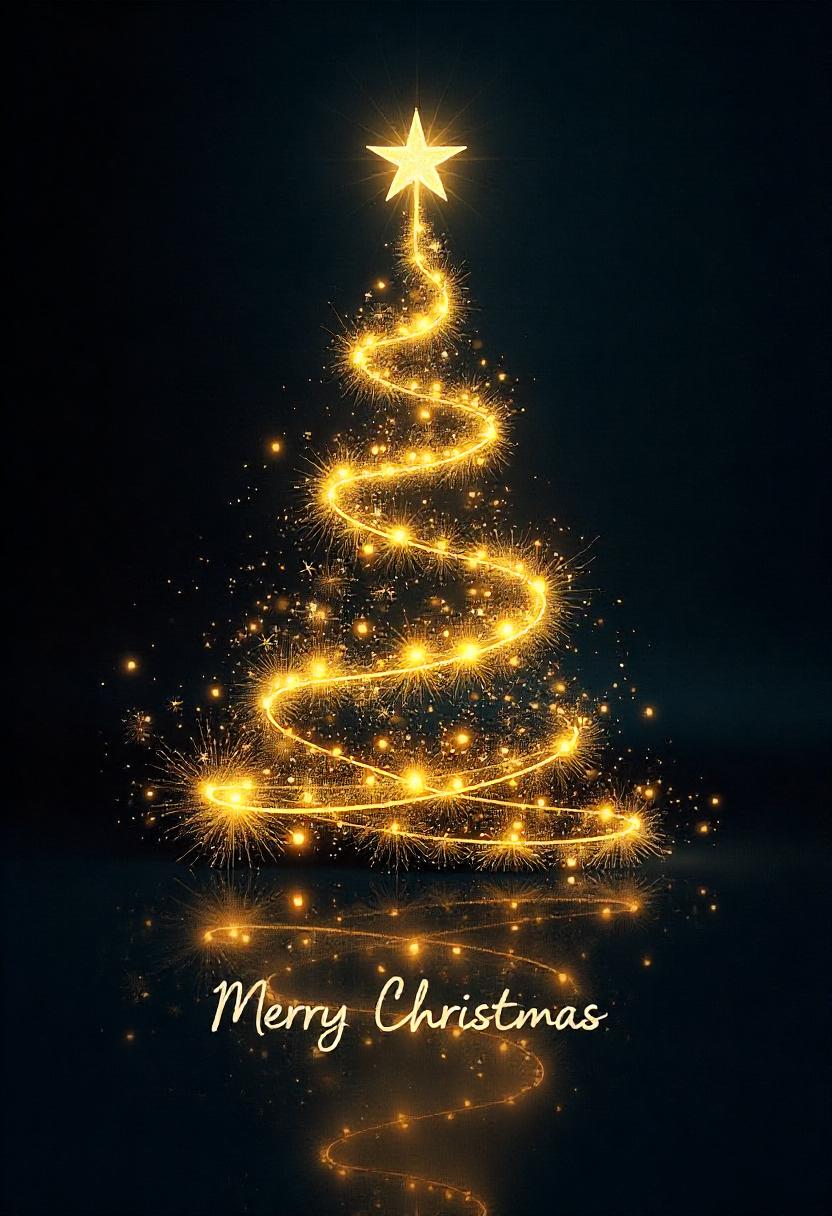 A spiral of golden light forms a Christmas tree against a black background.