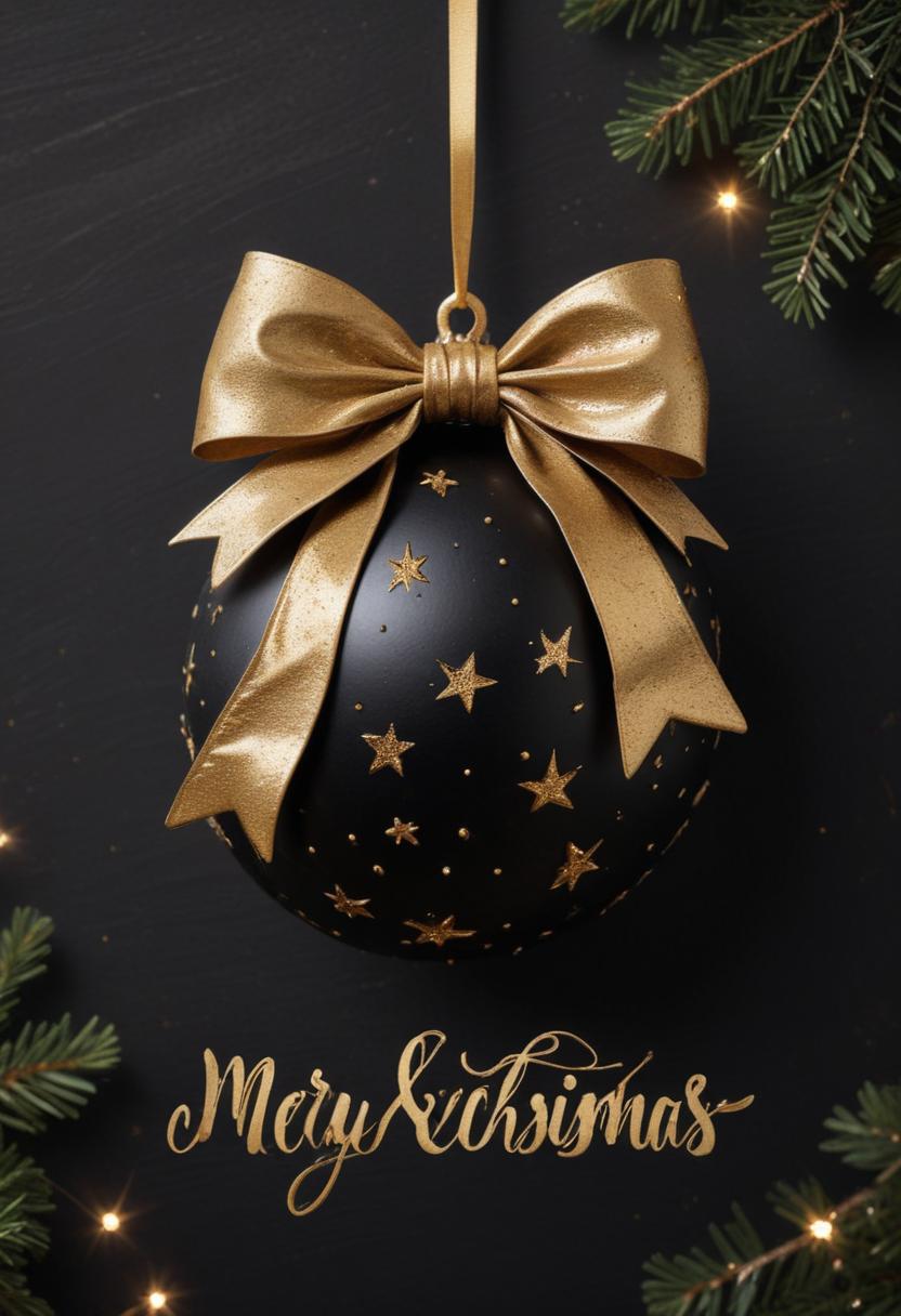 A black Christmas ornament with gold stars and a gold bow hangs from a string against a dark background.