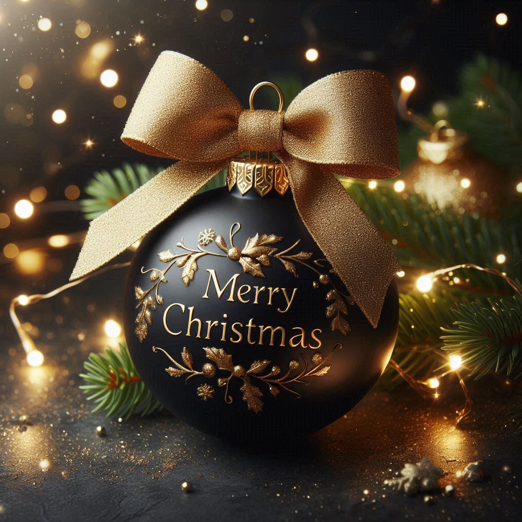 black ornament, celebration, christmas cheer, christmas decorations, christmas lights, christmas ornament, christmas tree, december, festive, glow, gold bow, gold ornament, holiday, holiday season, joy, merry christmas, pine branch, shiny, sparkle, winter