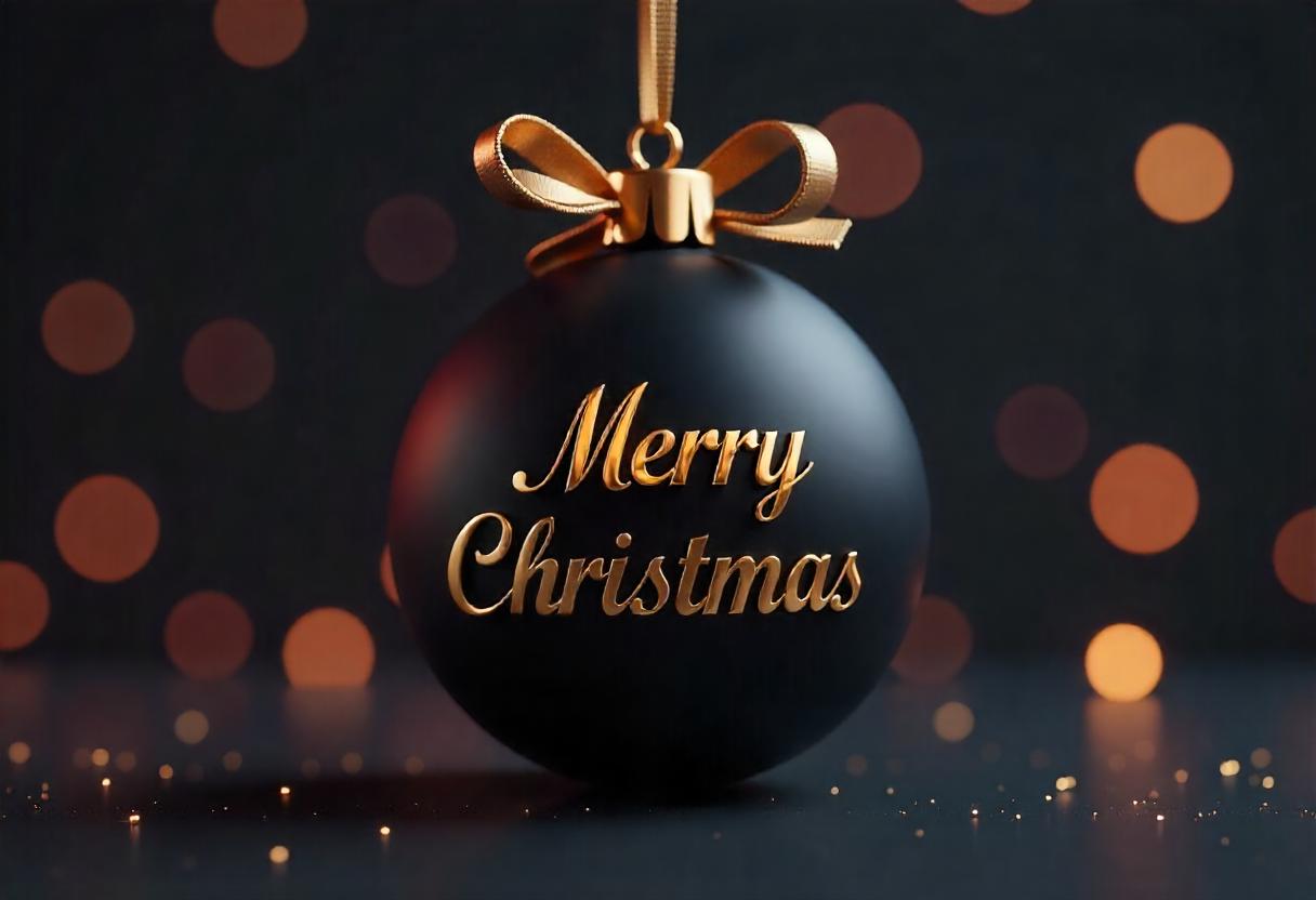 Black ornament with gold ribbon and 'merry christmas'