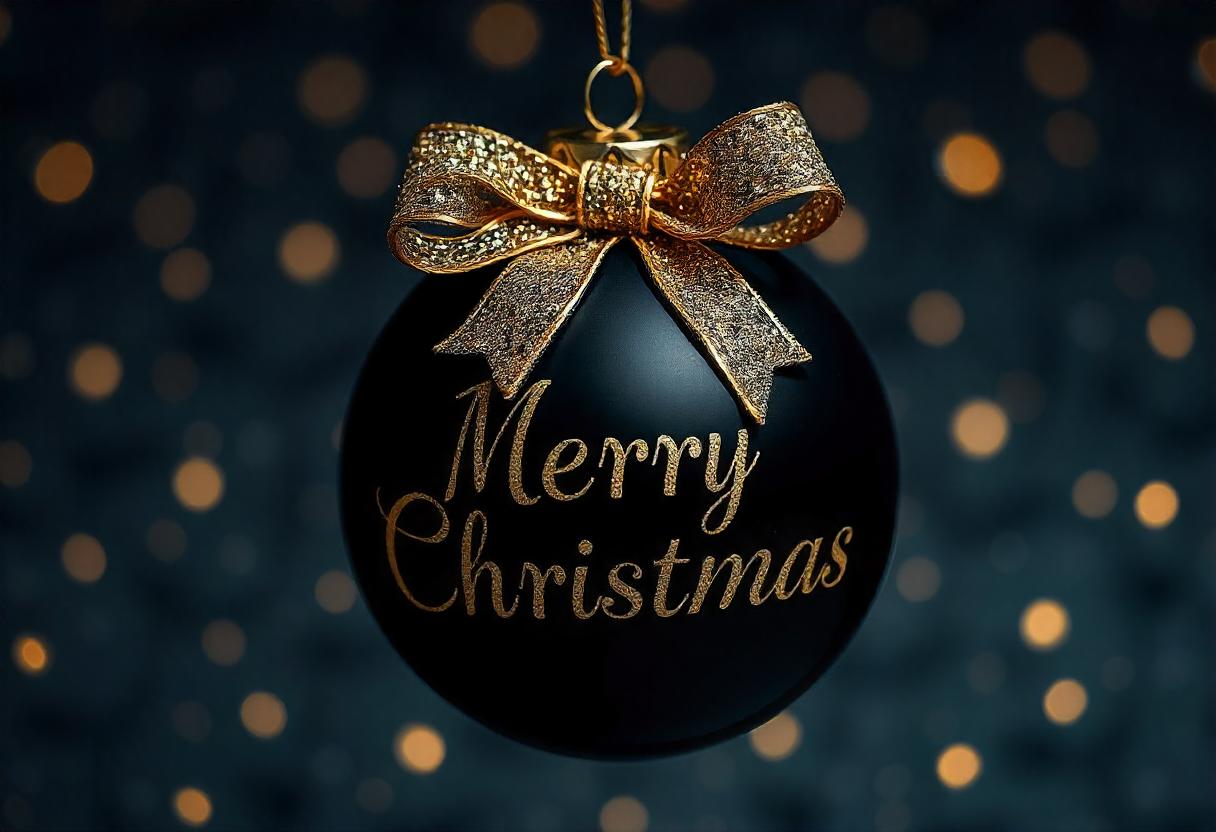 A black Christmas ornament with a gold bow and the words Merry Christmas written in gold hangs in front of a blurry background of gold lights.