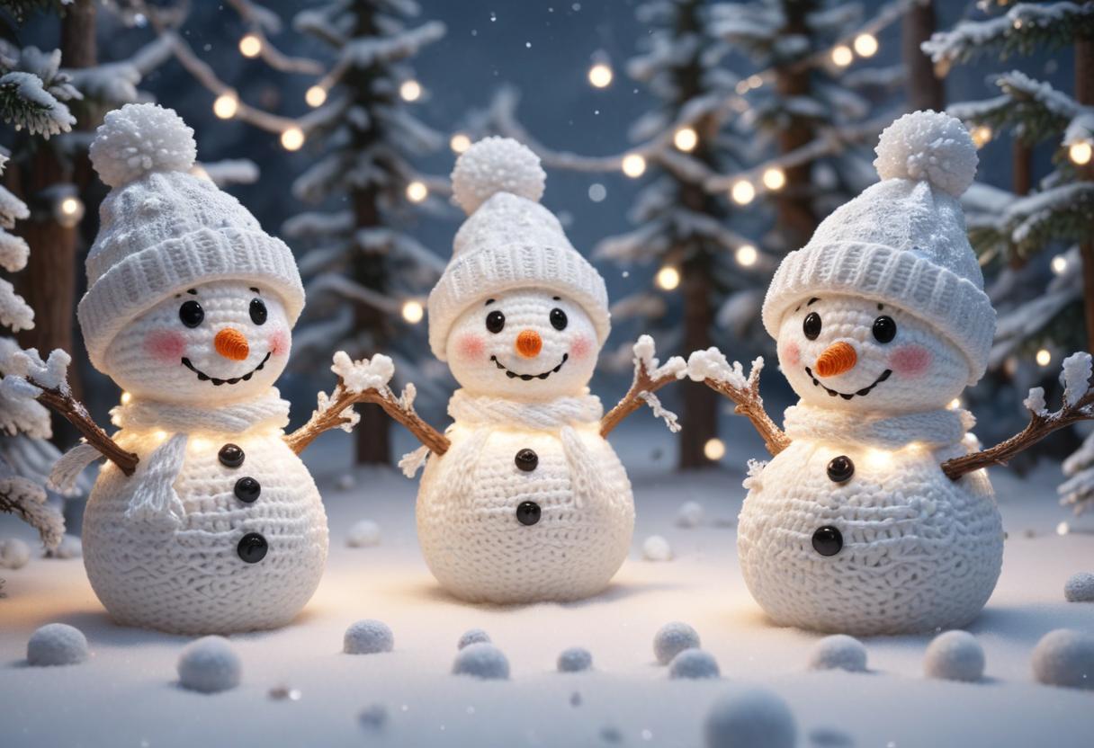 Three snowmen stand together in a snowy forest, smiling and surrounded by string lights. The snowmen are all wearing white knitted hats and scarves.