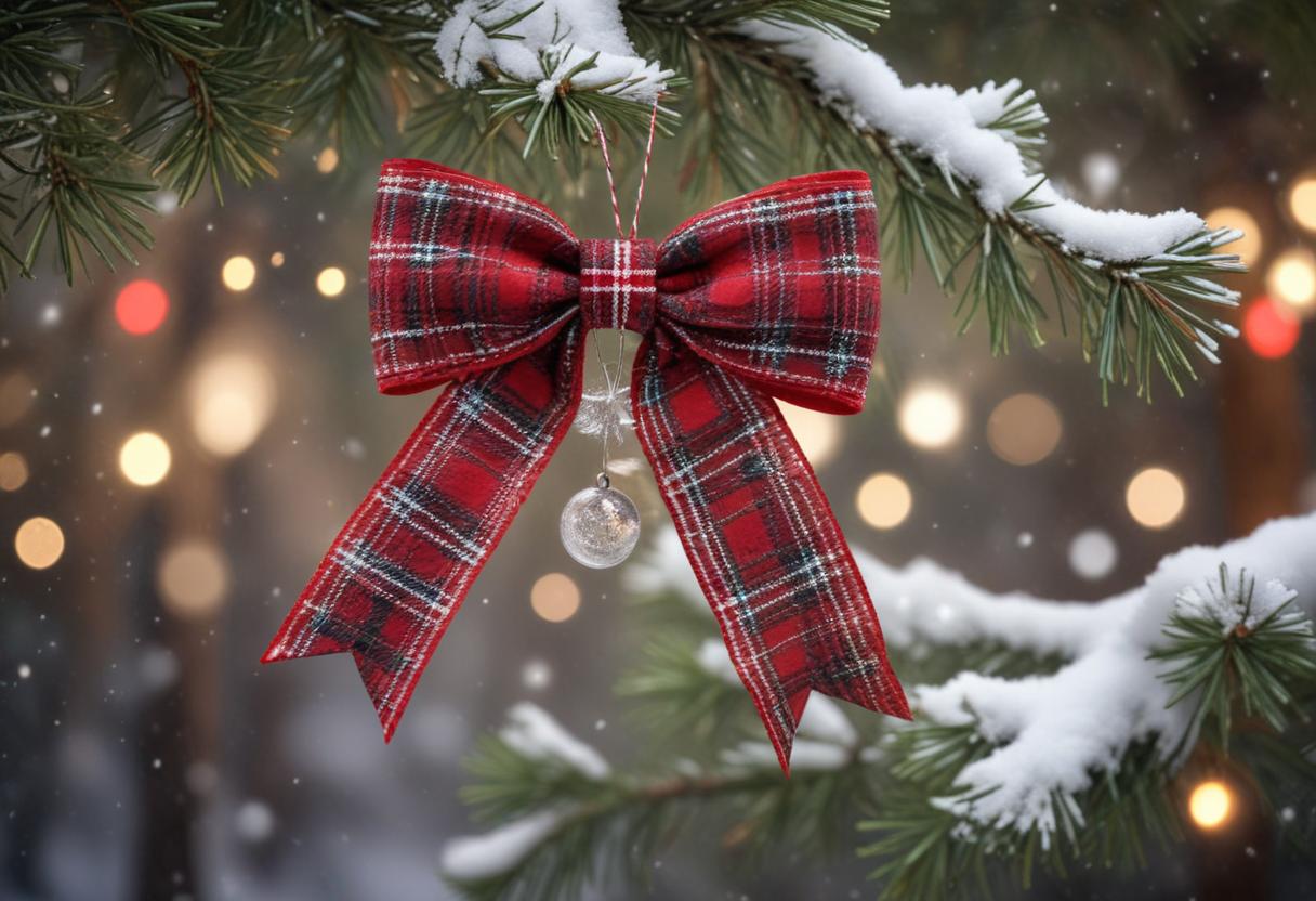 bow, branch, celebration, christmas, christmas tree, december, decoration, festive, green, holiday, lights, ornament, pine, plaid, red, season, snow, sparkle, white, winter