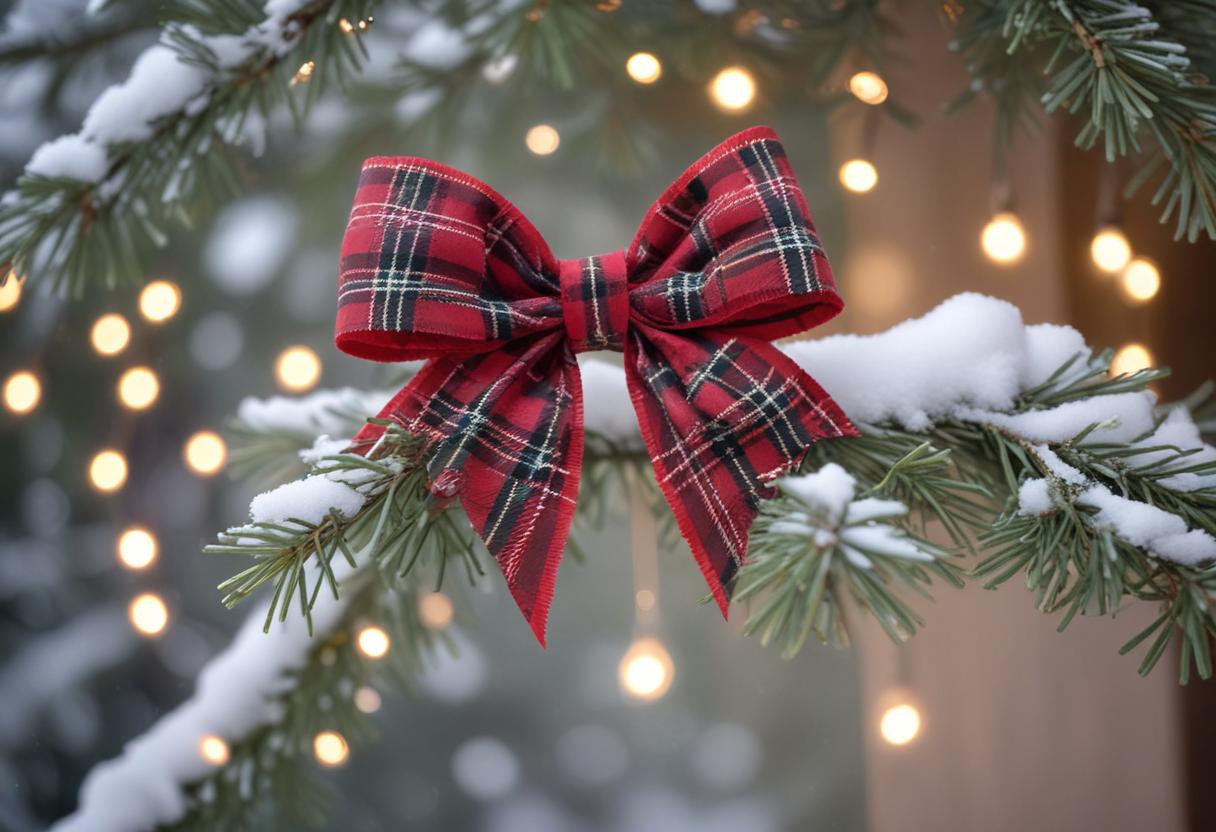 blurry, bow, branch, christmas, christmas lights, close up, decoration, festive, holiday, macro, outdoor, pine, pine branch, plaid bow, red bow, snow, snowy, string lights, tree, winter
