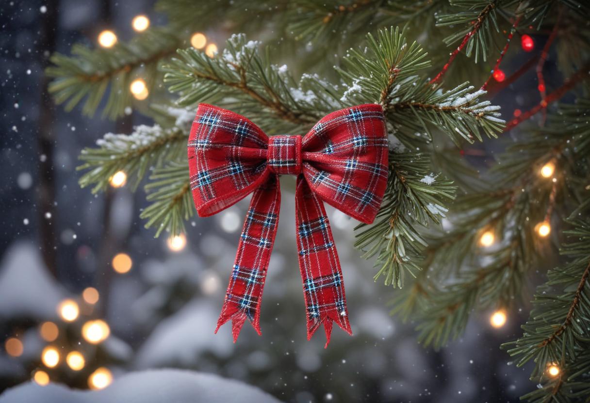 christmas, christmas bow, christmas decoration, christmas lights, christmas tree, decoration, festive, glittery, holiday, holiday season, lights, ornament, pine branch, plaid bow, red bow, snow, snow covered, winter, winter scene, winter wonderland