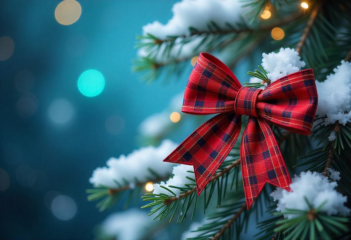 A red plaid bow is tied around a snowy evergreen branch. The branch is surrounded by a blue background with out-of-focus lights.