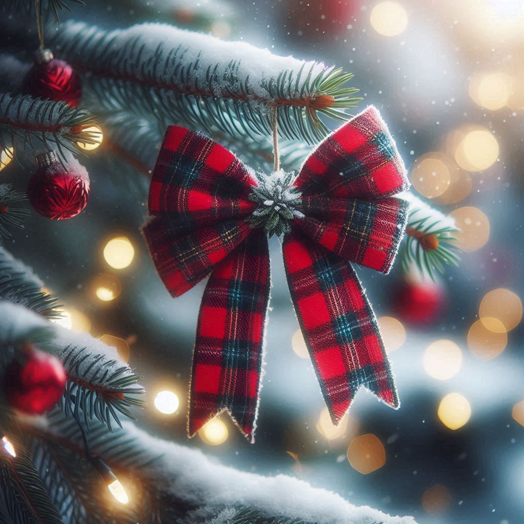 bokeh, bow, branch, christmas, december, decoration, festive, glitter, green, holiday, lights, ornament, pine, plaid, red, season, snow, sparkle, tree, winter