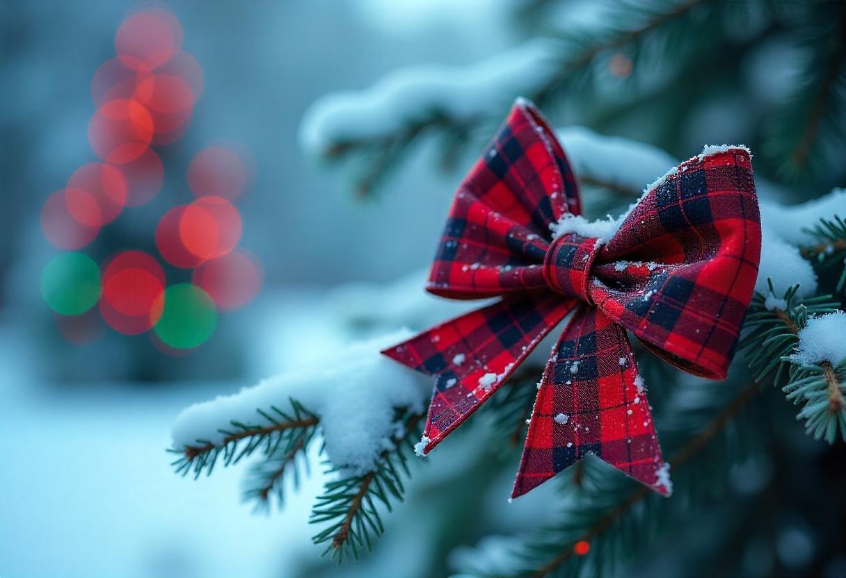 bow, branch, christmas, closeup, december, decoration, festive, holiday, lights, macro, nature, ornament, outdoors, pine, plaid, red, season, snow, tree, winter