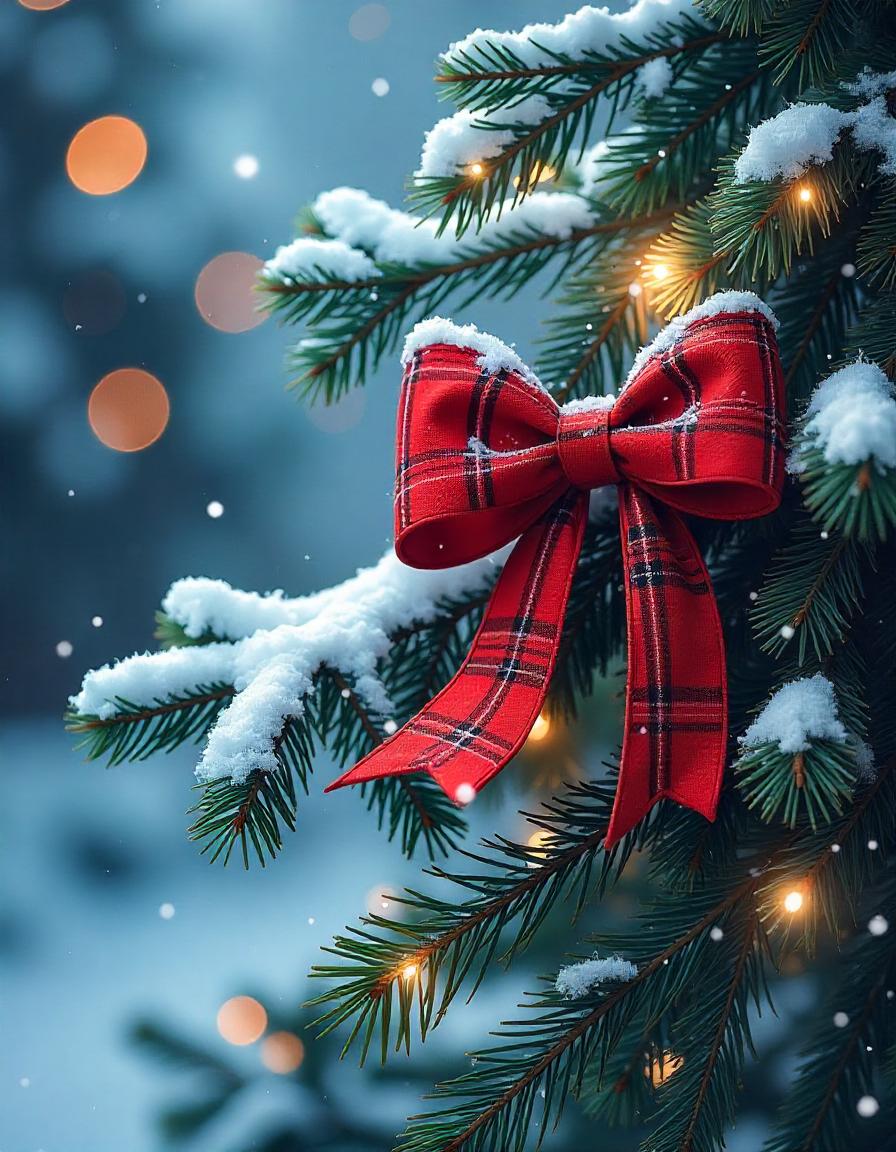 bow, branch, celebration, christmas, december, decoration, festive, green, holiday, january, lights, outdoors, pine, plaid, red, season, snow, tree, white, winter