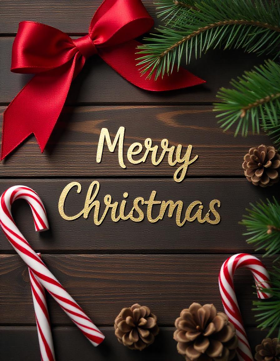 A wooden background with a red ribbon bow, a Merry Christmas message, candy canes, and pine cones.