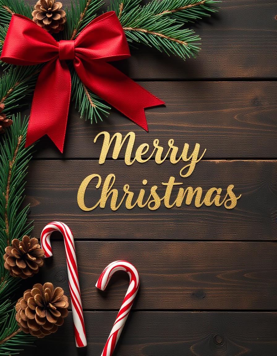A wooden surface with pine branches, a red bow, pinecones, and candy canes arranged in a festive Christmas theme.