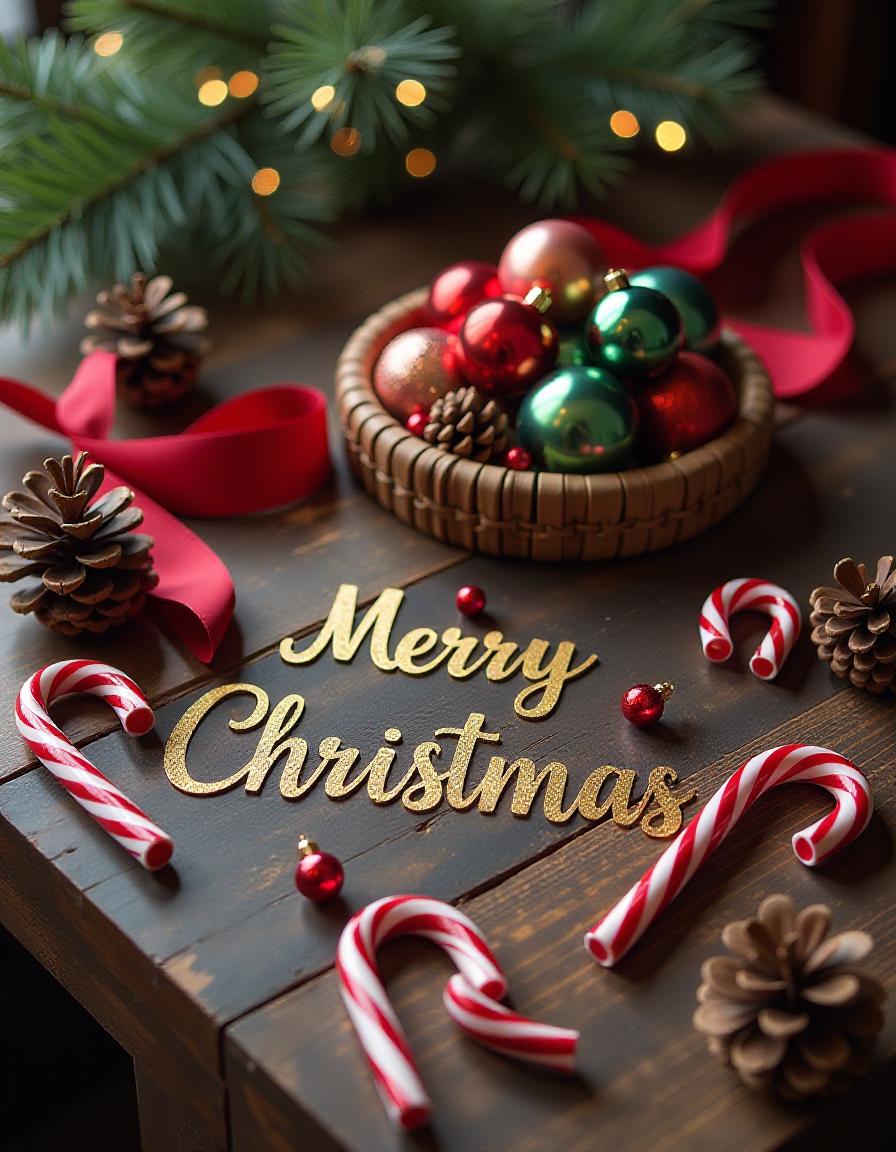 A wooden table is decorated for Christmas with a basket full of red and green ornaments, a red ribbon, pine cones, and candy canes.