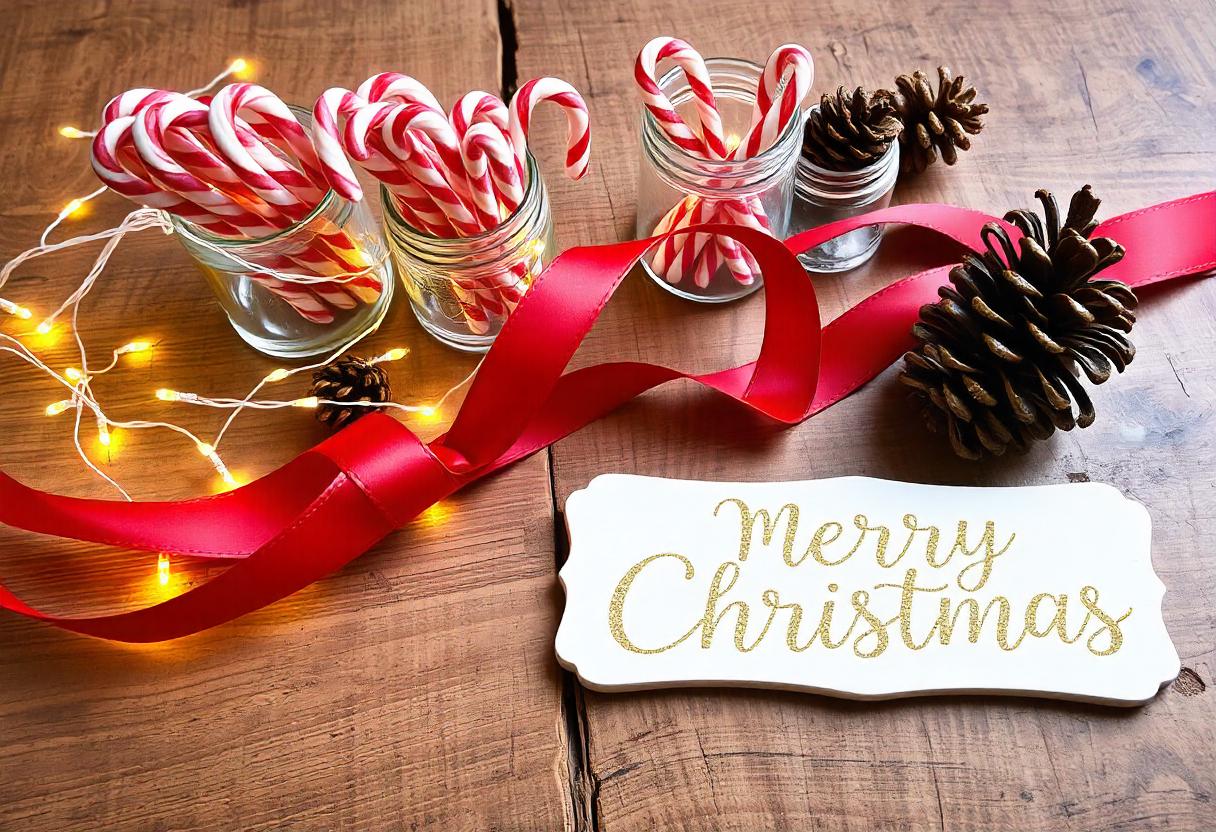 candy canes, celebration, christmas, christmas decor, december, decoration, festive, festive decor, gift, holiday, holiday decor, jars, lights, pine cones, red ribbon, sparkle, string lights, table decor, winter, wood table