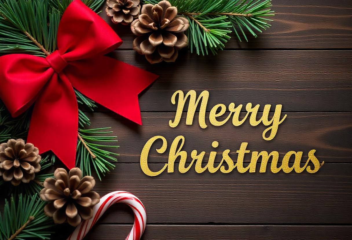 A wooden surface with a red bow, evergreen branches, pine cones, and a candy cane.
