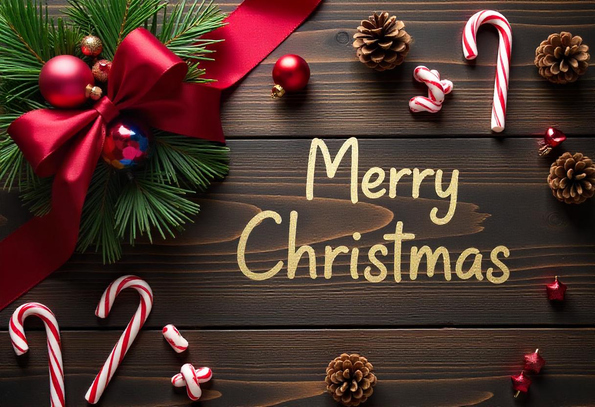 candy cane, celebration, christmas, christmas decor, december, decoration, festive, festive season, gold lettering, green garland, holiday, merry christmas, ornament, pine cone, red bow, winter, wood, wooden background, wooden surface, xmas