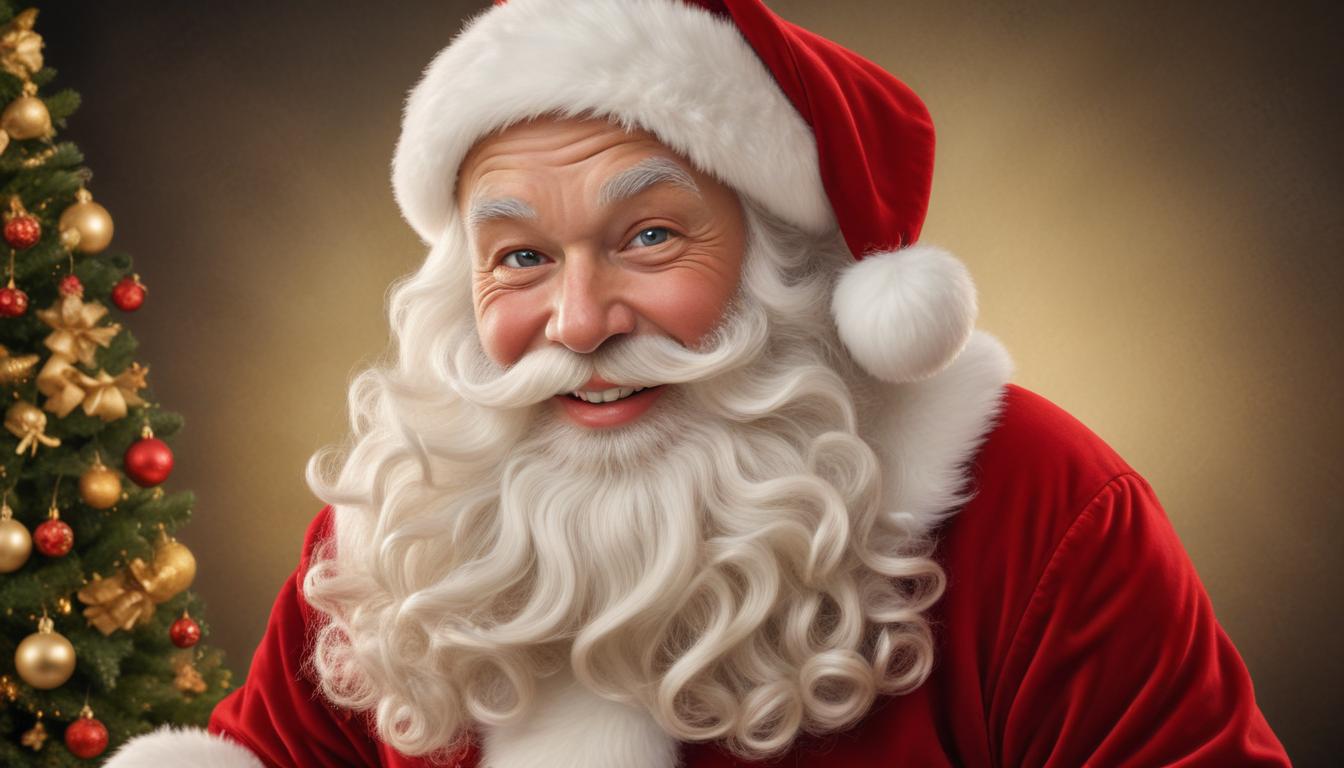 A close-up portrait of Santa Claus wearing his traditional red suit and white beard, with a decorated Christmas tree out of focus in the background.