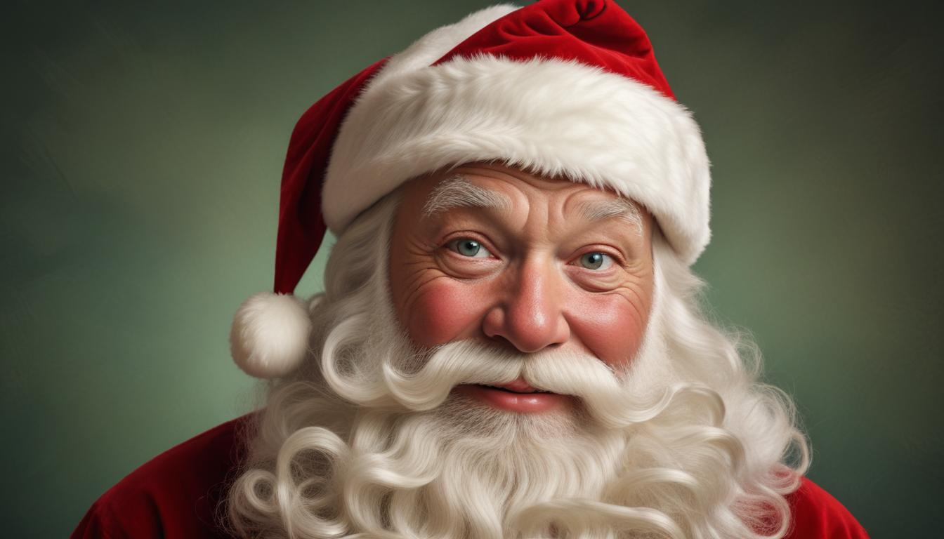A portrait of Santa Claus in his red suit and white beard. He is looking directly at the viewer with a slight smile.