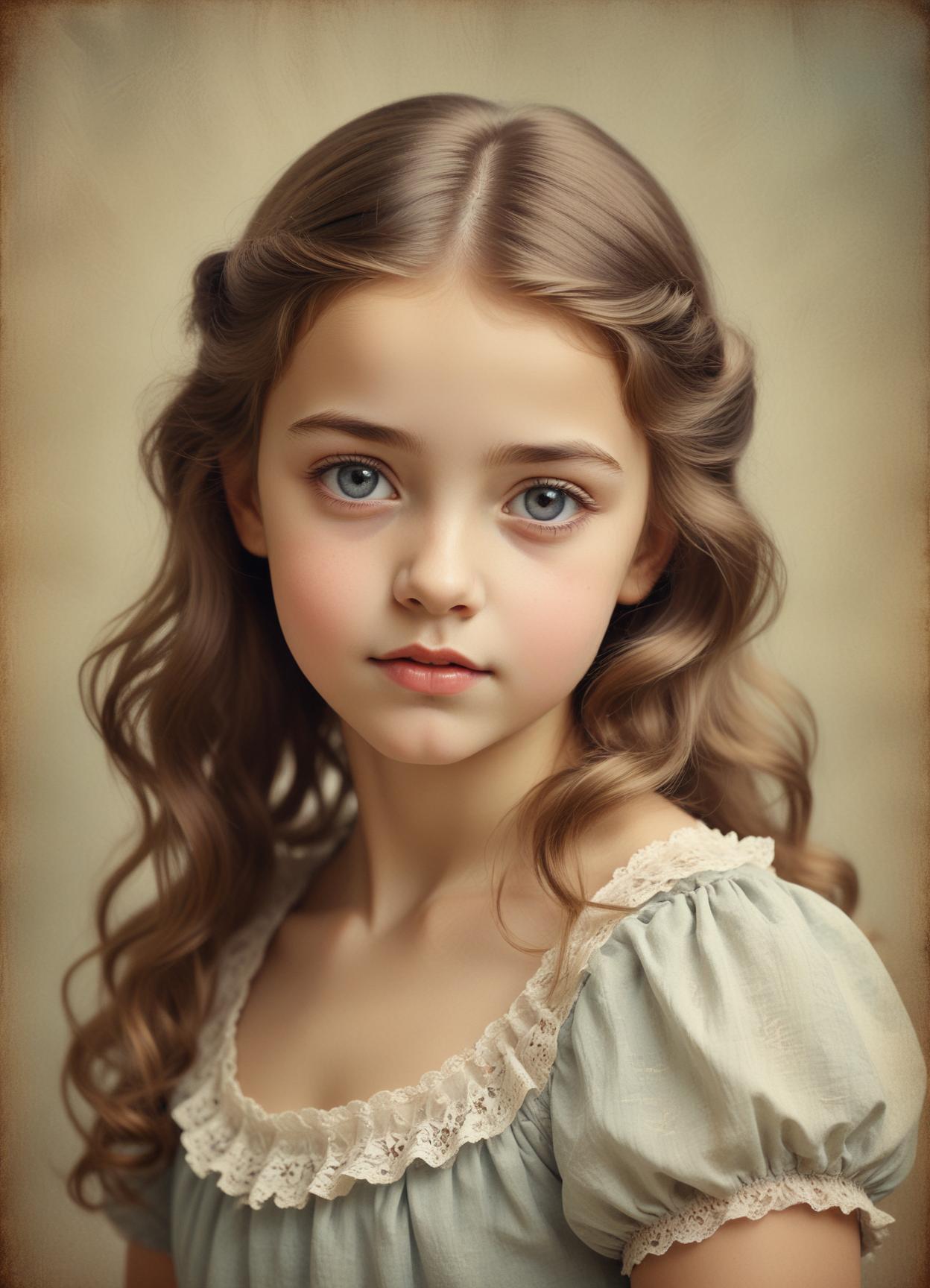 A portrait of a young girl with light brown hair, wearing a light blue dress with lace trim.