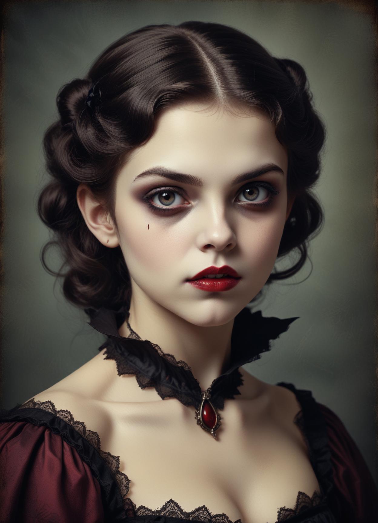 alluring, art, beauty, black lace, choker, dark eyes, dark hair, dramatic, elegant, fashion, gothic, intense stare, model, mysterious, portrait, red dress, red lips, victorian, vintage, woman