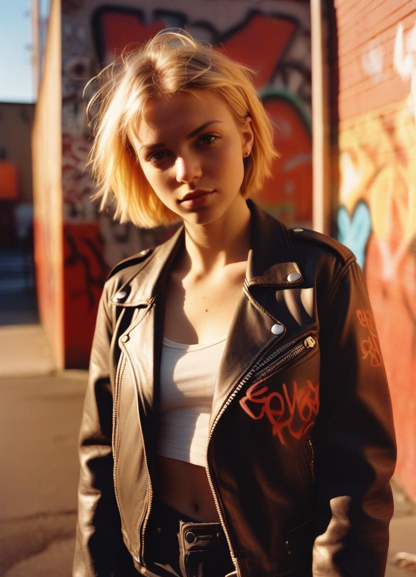 black jeans, blond hair, fashion, girl, graffiti, jacket, leather jacket, looking, model, portrait, pose, short hair, standing, street, sun, sunlight, urban, wall, white top, woman