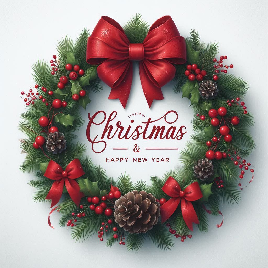 A Christmas wreath with a large red bow, green pine branches, red berries, and pine cones.
