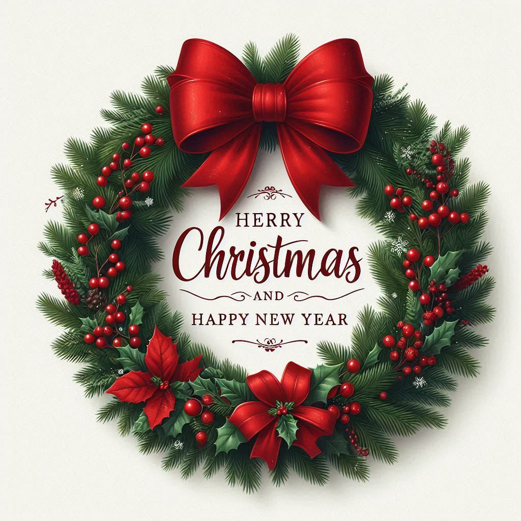 A green Christmas wreath decorated with red berries, holly leaves, and a large red bow with a sign that reads Merry Christmas and Happy New Year.