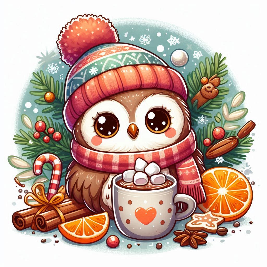 candy cane, cartoon, christmas, cozy, cute, december, drink, festive, hat, holiday, hot chocolate, illustration, marshmallows, orange, owl, scarf, snow, snuggle, warm, winter