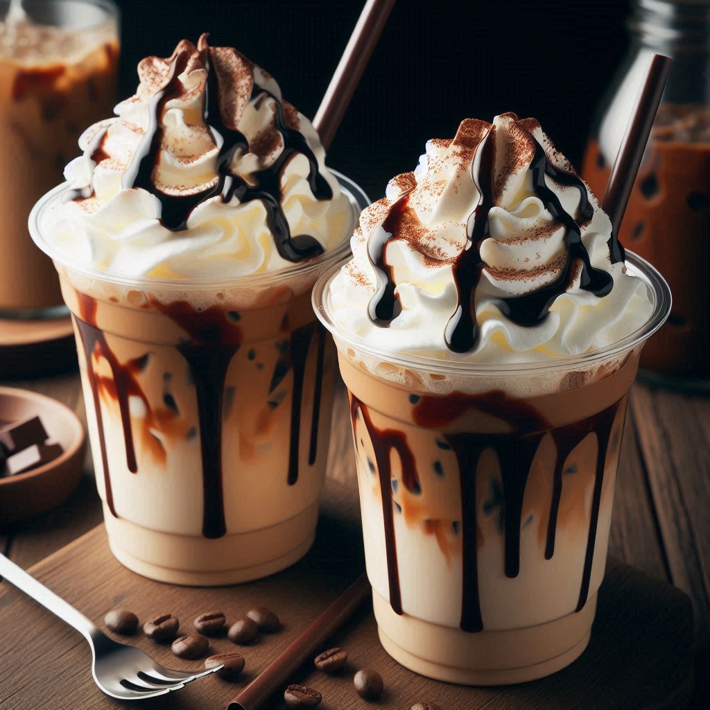 Two iced coffees in clear plastic cups with whipped cream and chocolate drizzle. The coffee is topped with a sprinkle of cinnamon.