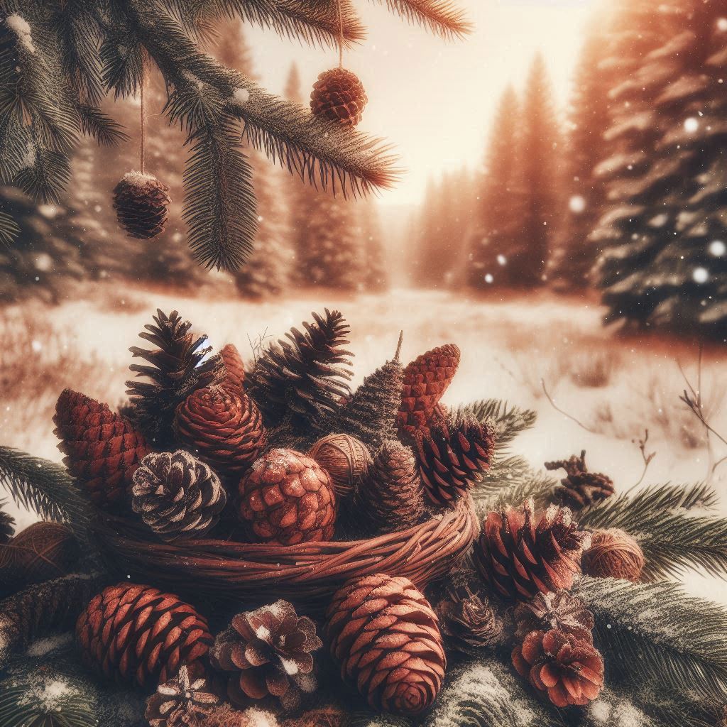 basket, branches, brown, christmas, december, festive, forest, green, holiday, nature, outdoors, pine cones, seasonal, snow, snowy, trees, white, winter, winter wonderland, woodland