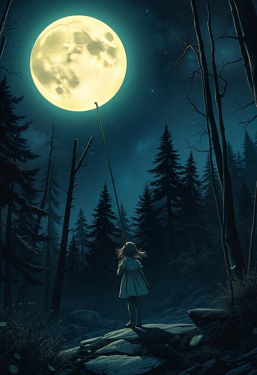 A girl reaches for the moon in a dark forest
