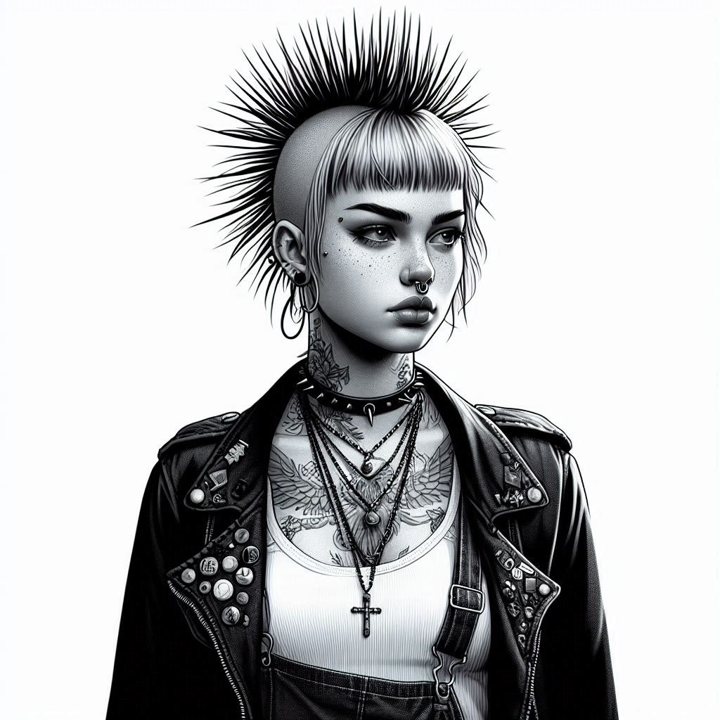 alternative, art, attitude, black overalls, cool, drawing, edgy, fashion, fierce, illustration, leather jacket, mohawk, monochrome, piercings, portrait, punk, rebellious, style, tattoo, woman
