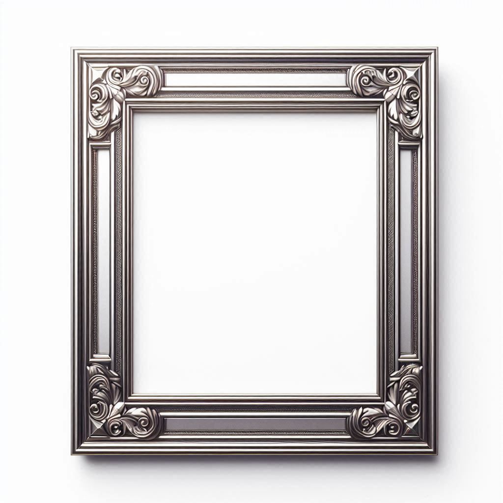 A silver picture frame with ornate carvings on the corners sits on a white background.