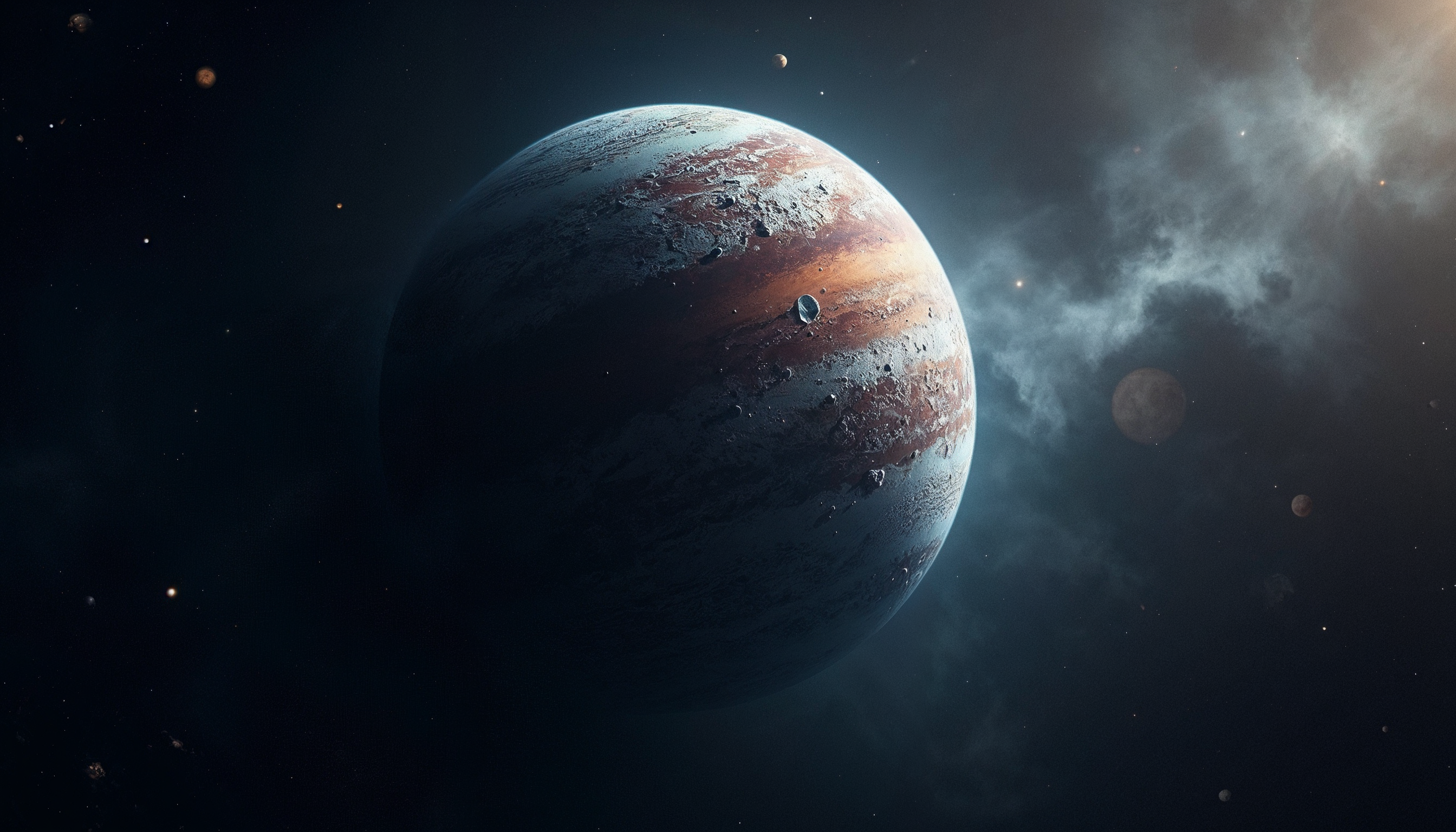 A large gas giant planet with red stripes and craters floats in space. It is surrounded by a faint cloud of gas and dust.