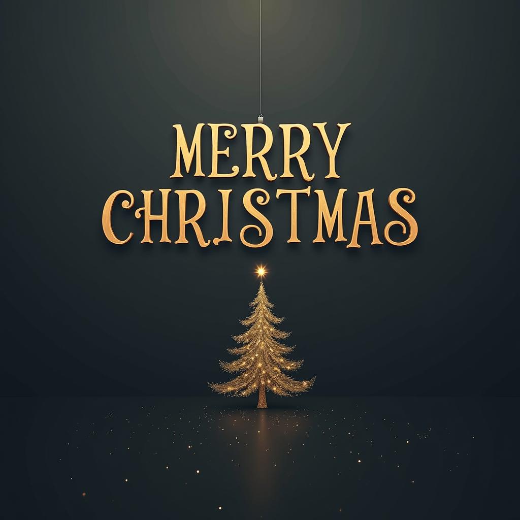 A golden Christmas tree hangs from the word Merry Christmas written in a golden, stylized font. The background is black with gold glitter.