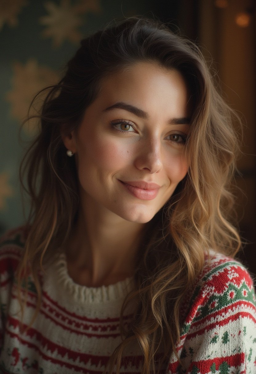 brown hair, casual, christmas, closeup, festive, happy, holiday, indoors, light, long hair, looking, pattern, portrait, red, side, smiling, sweater, white, winter, woman