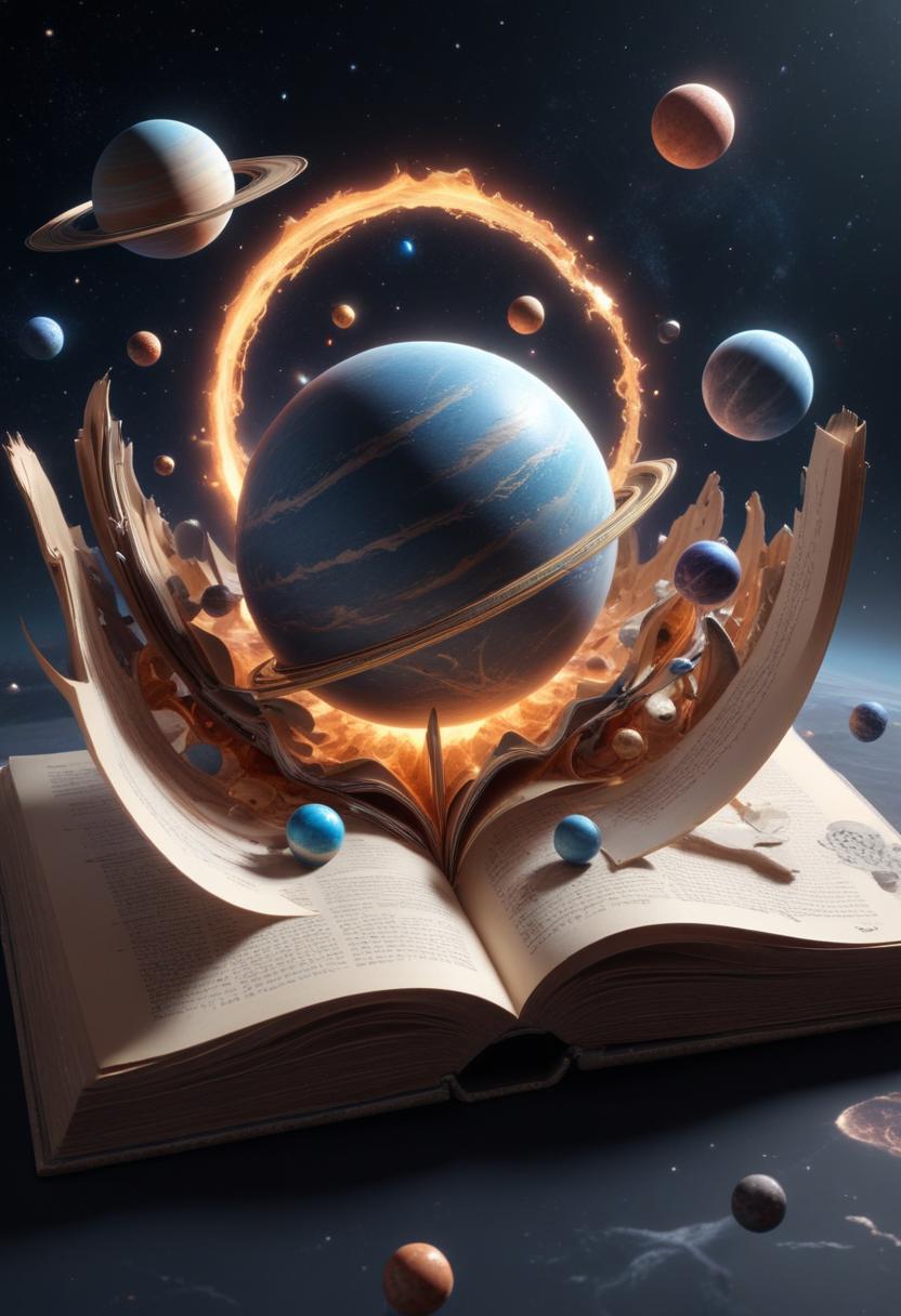 A swirling, colorful book erupts as a large ringed planet appears, surrounded by smaller planets and a fiery ring.