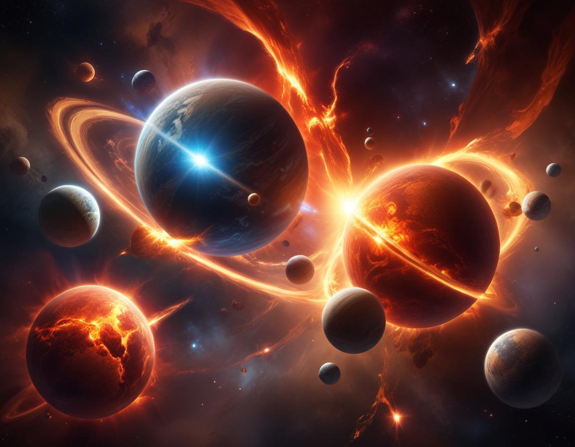 A digital illustration of planets colliding in a fiery cosmic event, with glowing rings and a bright light emanating from the center of the impact.