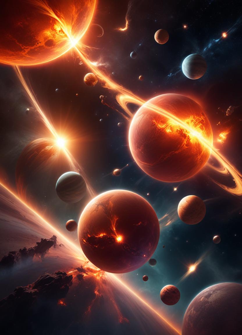 A chaotic digital illustration of exploding planets with fiery remnants set against a dark starry space background.
