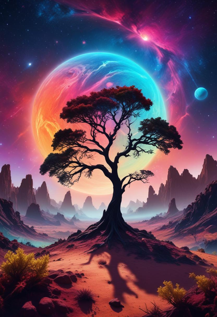 abstract, art, artwork, colorful, digital art, fantasy, landscape, mountain, nature, night, planet, red, sand, shadow, sky, space, stars, surreal, tree, vibrant