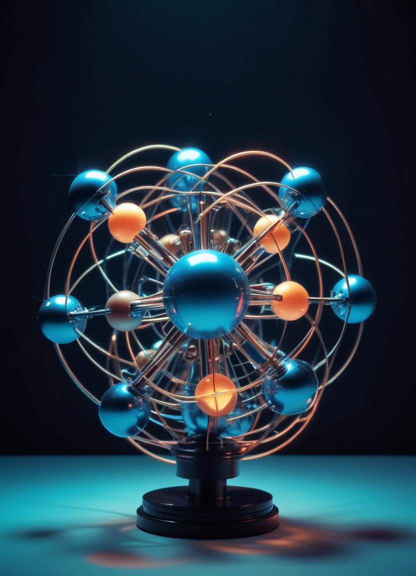A metal sculpture on a blue surface with blue spheres connected by metal wires. The spheres rotate around a center axis.