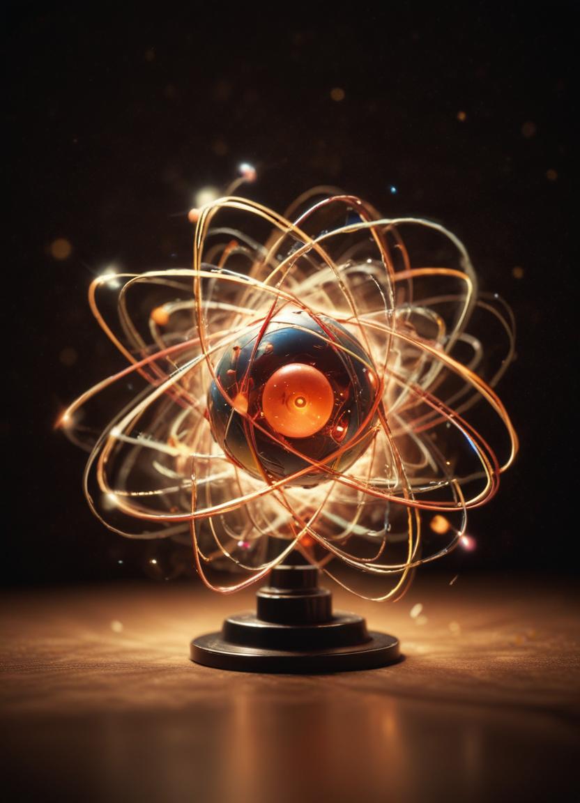 An atom model with a glowing orange core and orbiting electrons is displayed on a table.
