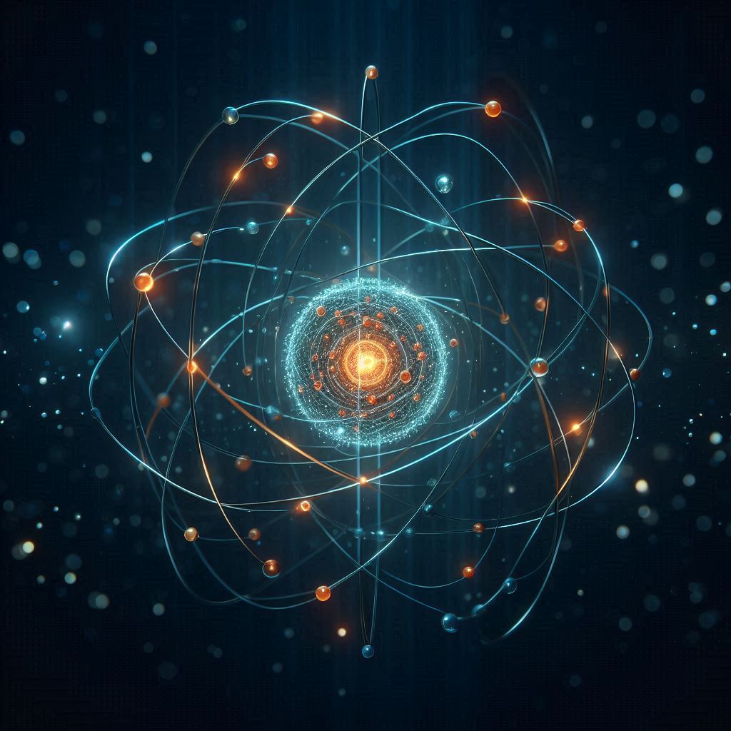 Digital art of an atom featuring a bright orange nucleus and glowing blue electrons in a complex pattern on a dark blue background.